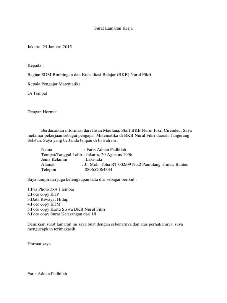 Maka lebih baik jika anda bisa mengemas contoh surat lamaran kerja lebih dari sebuah . Contoh surat lamaran pekerjaan dalam tulisan latin. Apa itu melamar pekerjaan dan lamaran pekerjaan? Dalam penulisan surat lamaran kerja, banyak hal yang harus diperhatikan agar surat lamaran kerja anda dapat diterima oleh perusahaan anda. Contoh surat lamaran kerja di cu.